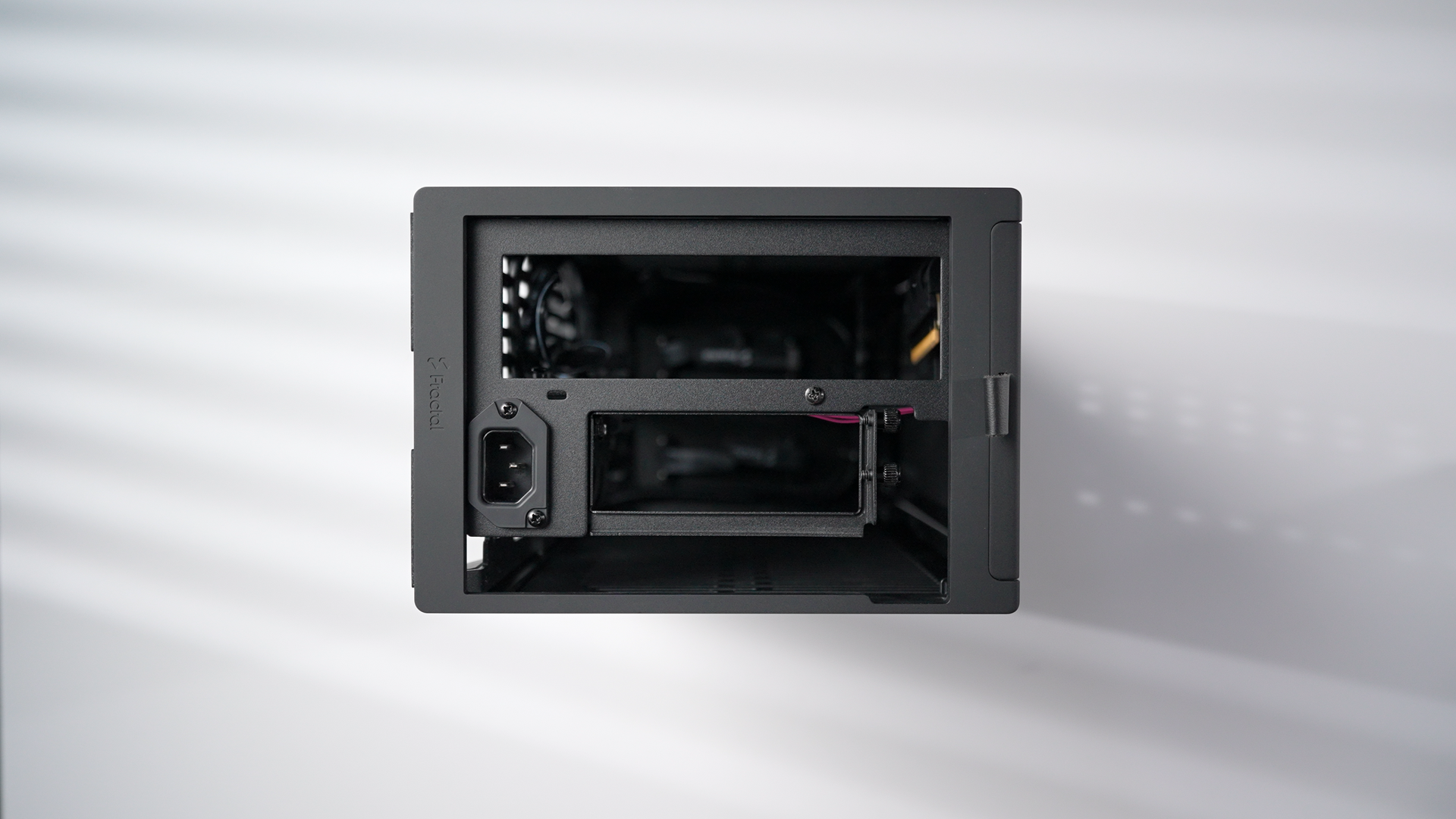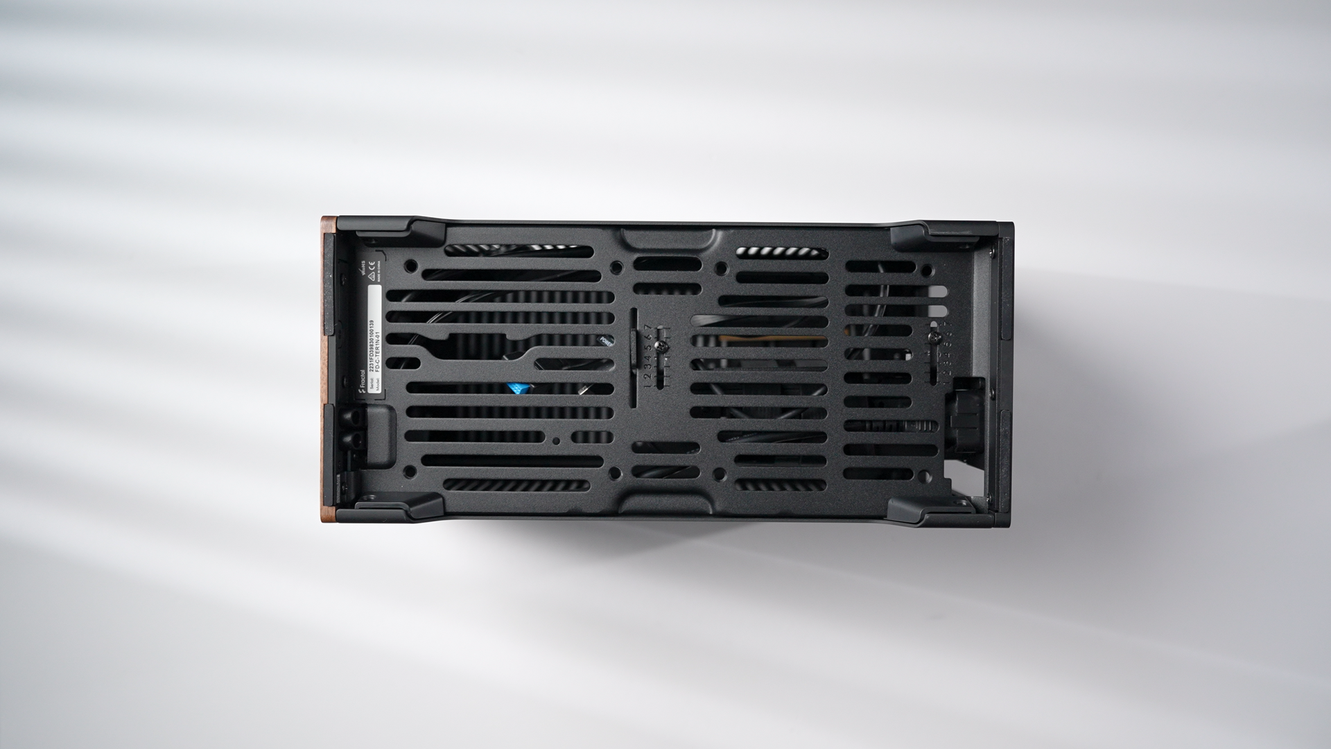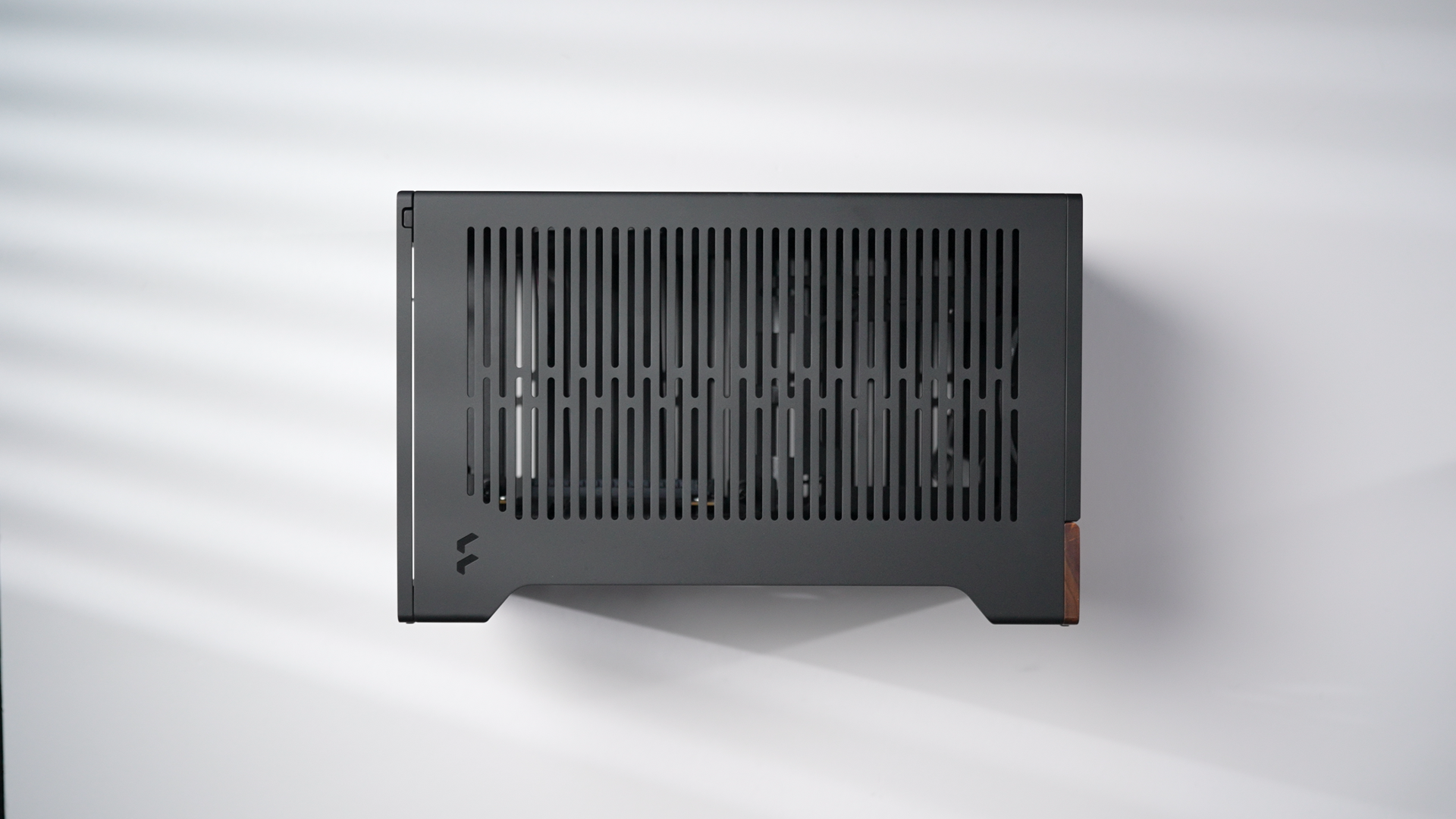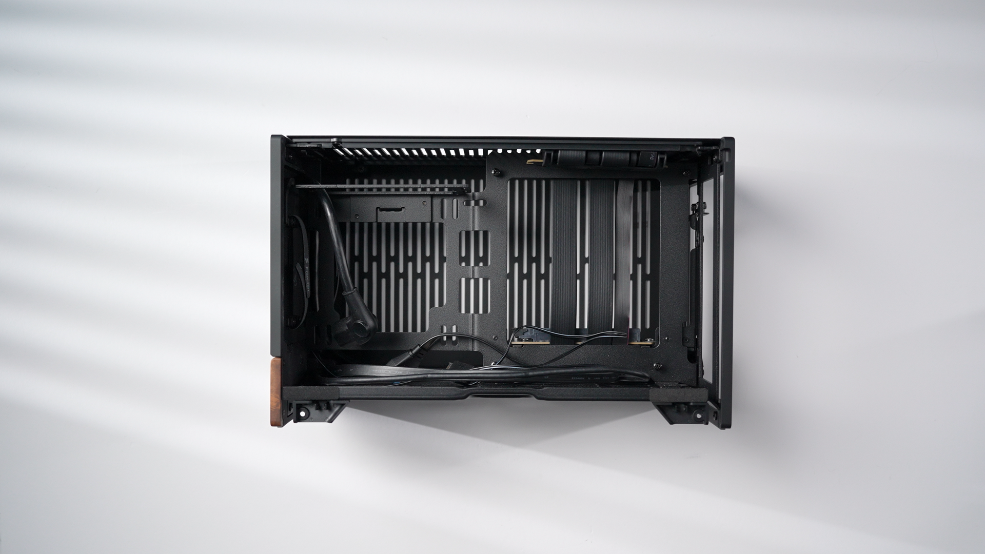 Panel removal is tool-less and intuitive: the side panels hinge up and pop off, while the top is secured with a hidden magnetic leather tab. It’s a clever system that makes accessing the internals feel effortless and more enjoyable than many ITX cases, which often feel cramped or fiddly.