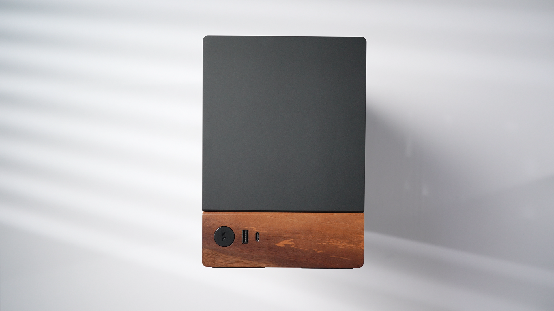 The standout aesthetic of the Terra is its blend of industrial and natural design elements. The aluminum body contrasts with a real walnut wood panel on the front, giving it a premium feel that fits seamlessly into modern living spaces. It doesn’t scream “gaming PC,” and that’s part of its appeal.
